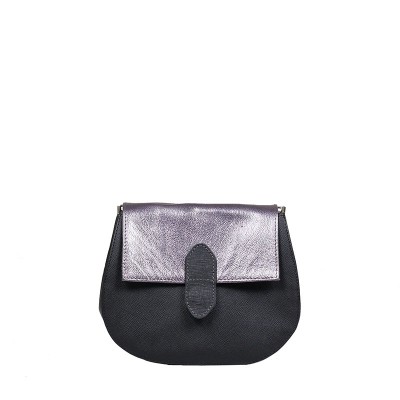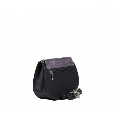 Torebka mini, skórzana na ramię z czarnej skóry licowej i fioletową ozdobną klapą. Zapięcie na magnes oraz tylna kieszeń na suwak zapewniają bezpieczeństwo. Regulowany pasek łączy w ciekawy sposób skórę z łańcuszkiem. W środku - podszewka, smycz na klucze i kieszeń na karty.