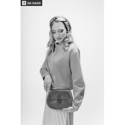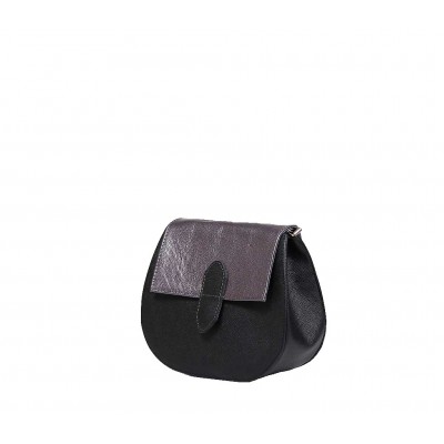 Torebka skórzana na ramię. Podstawa wykonana jest ze skóry licowej w kolorze czarnym. Klapa ze skóry ozdobnej w kolorze fioletowym. Zapinana na magnes. Z tyłu znajduje sie bezpieczna kieszeń na suwak. Całość uzupełnia pasek skórzany połączony z eleganckim łańcuszkiem. Wnętrze: podszewka, smycz na klucze, kieszeń na karty.