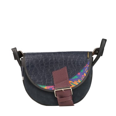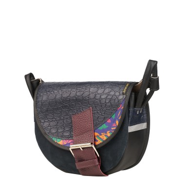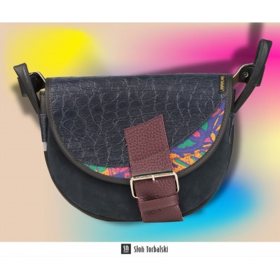 Dekoracyjny element na klapie w żywych kolorach stanowi ciekawy akcent (wzór ze względu na wycięcie z większego fragmentu może nieznacznie różnić się od tego na zdjęciu). Przód wykonany jest z czarnej skóry zamszowej, a tył ze skóry licowej.