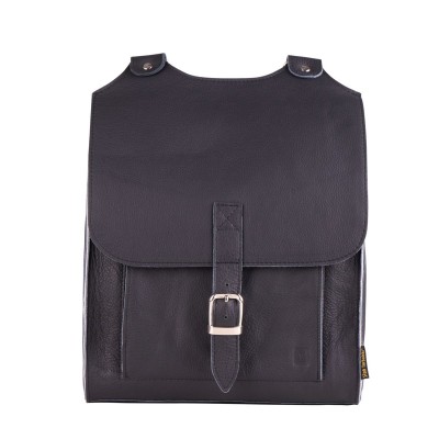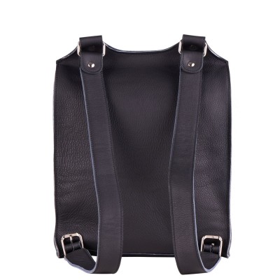 Pojemny plecak wykonany z wysokiej jakości naturalnej skóry licowej w kolorze czarnym. Klapa oraz język również zostały wykonane ze skóry licowej w tym samym odcieniu, tworząc spójną i elegancką całość. Z przodu znajduje się praktyczna kieszeń. Regulowane szelki z klamrami zapewniają wygodę noszenia. Plecak z łatwością pomieści dokumenty w formacie A4.
