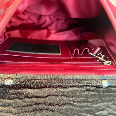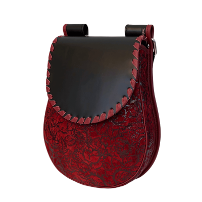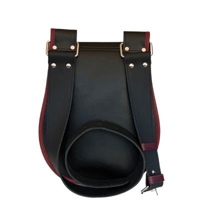 Dół torebki skórzanej zachwyca delikatnie tłoczoną strukturą, która pięknie kontrastuje z gładką, czarną klapą. Całość zyskuje wyjątkowy charakter dzięki ręcznie wykonanemu czerwonego przeplotowi na brzegach klapy oraz mocnemu, szerokiemu paskowi, który zapewnia pełen komfort podczas noszenia. Regulowany pasek pozwala dopasować listonoszkę idealnie do sylwetki i stylu noszenia.