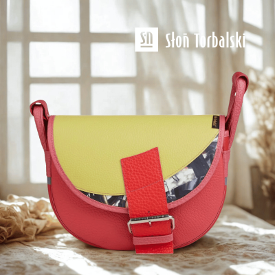 Podstawa torebki wykonana jest z wysokiej jakości skóry licowej o naturalnym czerwonym odcieniu, nadając jej elegancji i trwałości. Klapa torebki w intensywnym żółtym kolorze z wstawką ozdobnej skóry dodaje torebce wyrazistości i charakteru. Torebka zapinana jest za pomocą klamry i magnesu, które znajdują się pod językiem, co zapewnia bezpieczeństwo i łatwy dostęp do zawartości. Dodatkowo główna komora torebki jest zamykana na zamek błyskawiczny, chroniący przed przypadkowym wypadnięciem przedmiotów.