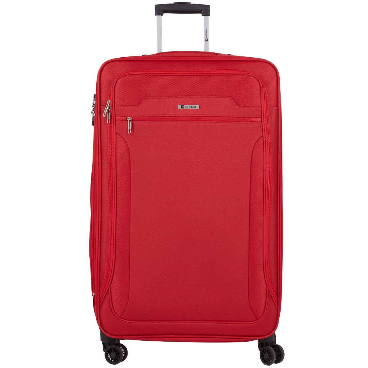 Walizka podróżna miękka, duża, w czerwonym kolorze, o wymiarach 80x46x28 cm i pojemności 99 l, idealna na dłuższe wyjazdy. Wykonana z poliestru i nylonu żakardowego, posiada cztery podwójne kółka, wyciągany stelaż oraz stopki ułatwiające stabilne ułożenie. Zewnętrznie podróżna walizka jest wyposażona w dwie kieszenie oraz poszerzenie za pomocą suwaka, co umożliwia zwiększenie pojemności.