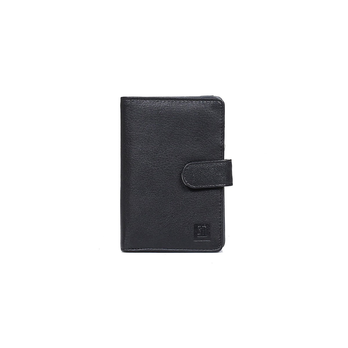 Klasyczny portfel damski skórzany w głębokim czarnym kolorze, ozdobiony eleganckim tłoczonym logo Słoń Torbalski. To duży skórzany damski portfel z dobrze zorganizowanym wnętrzem, oferującym szesnaście miejsc na karty, dwie otwarte przegrody, dodatkowe płaskie kieszonki (trzy wewnątrz, jedna na zewnątrz), miejsce na bilon zamykane na zamek oraz kieszonkę z siateczki. W orientacji poziomej, z zapinaną na zatrzask klapą.