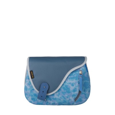Podstawa torebki wykonana jest ze skóry welurowej w kolorze niebieskim, ozdobionej ciekawym wzorem, co nadaje jej unikalnego i stylowego charakteru. Klapa torebki wykonana jest z gładkiej skóry licowej, a całość uzupełnia niebieski język również wykonany ze skóry licowej, co dodaje jej elegancji.