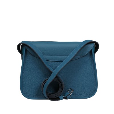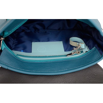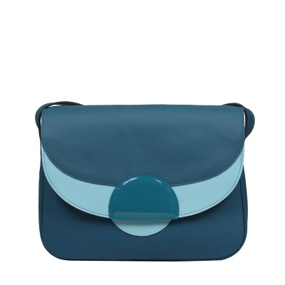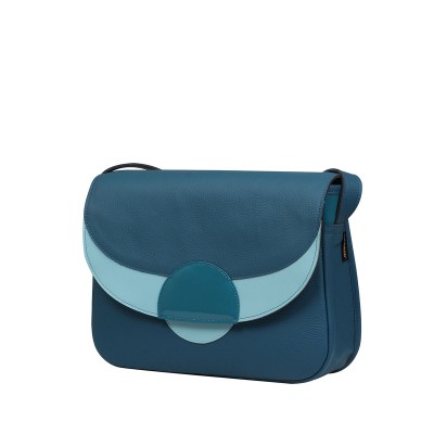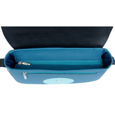 Wyjątkowa torebka z naturalnej skóry licowej w kolorze morskim z ozdobnymi geometrycznymi wstawkami w odcieniach morskiego i błękitu. Mieści format A5, ma praktyczne kieszonki wewnątrz i dodatkową kieszeń pod klapą. Zamykana na zamek i magnes, z regulowanym paskiem do 150 cm.
