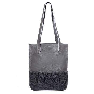Pojemna torba damska Margaret to elegancka shopperka ze skóry licowej w popielatym kolorze. Mieści format A4 i świetnie sprawdzi się na co dzień. Na przodzie znajduje się kontrastowa niebieska kieszeń, dodająca charakteru. Główna komora zamykana jest wygodnym magnesem, a wnętrze wykończone naturalną skórą kryje kieszeń na drobiazgi również na magnes.