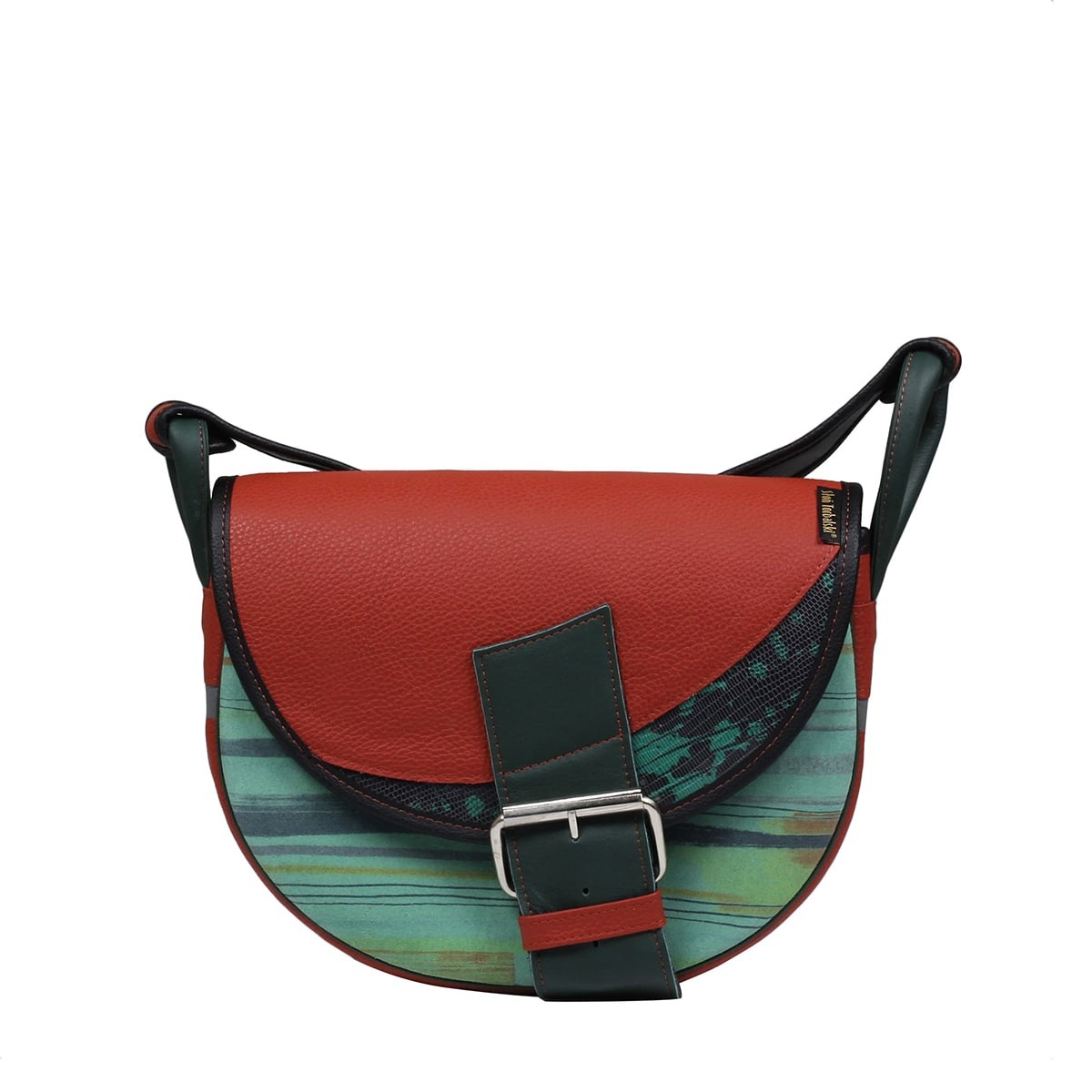 Skórzana torebka damska Freshman Mini to kwintesencja unikalnego designu i doskonałej organizacji. Jej pomarańczowa podstawa z welurowej skóry naturalnej ozdobiona jest wzorem, nadając torebce uroku i niepowtarzalności. Beżowa klapa z licowej skóry oraz brązowy język z klamrą pełnią funkcję ozdobnego zapięcia, dodając listonoszce charakteru. Dodatkowo, ozdobna wstawka z pomarańczowej skóry ozdobnej o ciekawej fakturze stanowi efektowny detal, sprawiając, że Freshman Mini nie tylko zachwyca designem, ale również oferuje przemyślane wnętrze dla doskonałej organizacji.