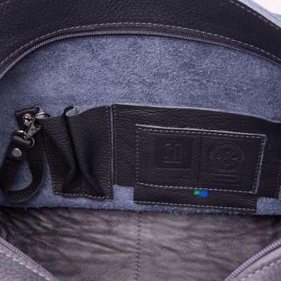 Szara damska listonoszka z klapą, wykonana ze skóry naturalnej w stylu vintage. Można ją nosić w dłoni dzięki krótkiej rączce na ramieniu lub po przekątnej dzięki długiemu paskowi do regulacji. Komora główna skórzanej listonoszki mieści formatA4 i jest zapinana na zamek. W środku znajduje się kieszonka, smyczka na klucze i kieszonka na długopisy. Z przodu torby jest jedna duża kieszeń a z tyłu jedna kieszeń zapinana na zamek. Całość torby skórzanej zapinana jest klapą zakończoną dwoma zatrzaskami teczkowymi zamontowanymi na dwóch paskach z klamerkami.