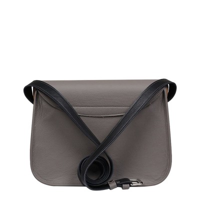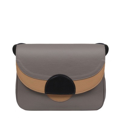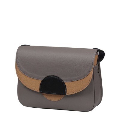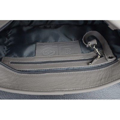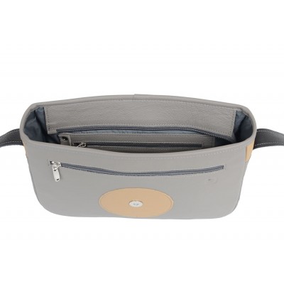 Średniej wielkości torebka z popielatej skóry naturalnej z geometrycznymi zdobieniami na klapie. Mieści format A5, ma praktyczne kieszonki w środku i dodatkową kieszeń pod klapą. Regulowany pasek do 150 cm gwarantuje wygodę na co dzień.