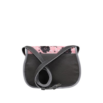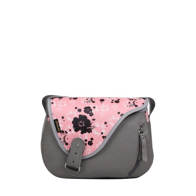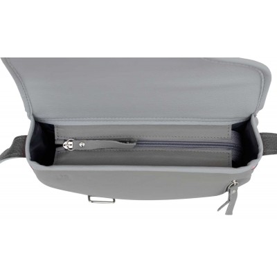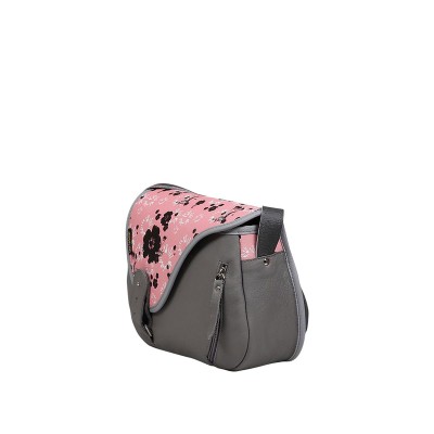 Mouse to średniej wielkości torebka damska na ramię ze skóry naturalnej. Podstawa w kolorze popielatym, z komorą główną zamykaną na suwak. Klapa ozdobna w kolorze różowym z unikalnym nadrukiem, a na przodzie listonoszki znajduje się zasuwana kieszeń. Nietypowe zapięcie z językiem z bolczykiem dodaje skórzanej listonoszce oryginalności.