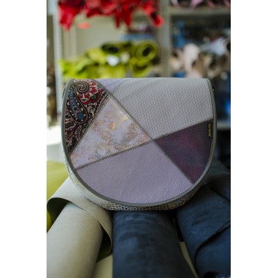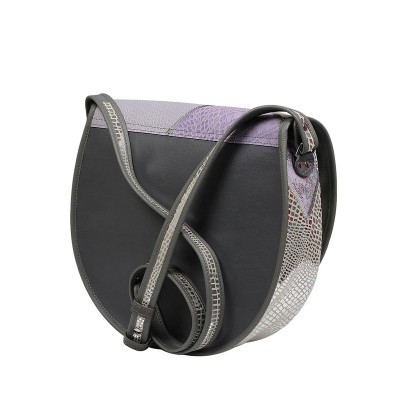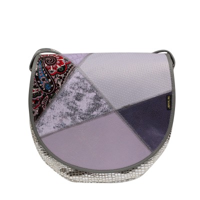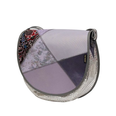 Półokrągła torebka z naturalnej skóry, z ozdobną klapą w odcieniach fioletu i srebrnym patternem na popielatej bazie. Pojemna, z regulowanym paskiem, zamknięciem na magnes i praktycznymi kieszeniami. Wymiary: 31×28×8,5 cm.