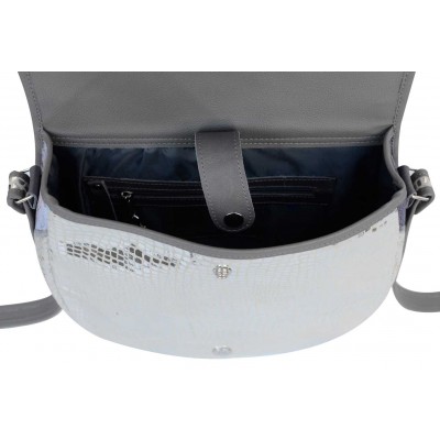Podstawa torebki skórzanej na ramię jest wykonana ze skóry dekoracyjnej welurowej w kolorze popielatym z błyszczącym srebrnym patternem. Klapa ze skóry licowej i ozdobnej o różnych odcieniach fioletu, dzięki temu torebka bez wątpienia przykuwa wzrok. Komora główna jest bardzo pojemna, do torebki przymocowany jest pasek regulowany przy pomocy klamerki. Całość zamykana za pomocą magnesu pod klapą. Dodatkowo wnętrze zabezpieczone metalowym zatrzaskiem.