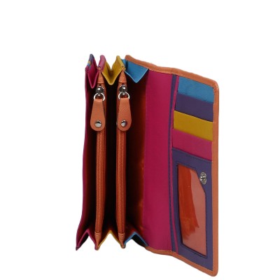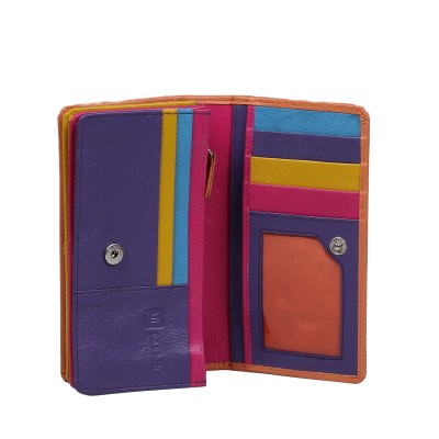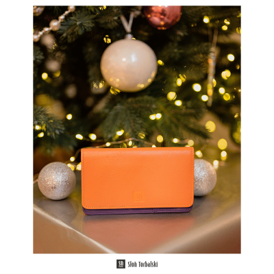 Portfel skórzany damski od Słonia Torbalskiego w energetycznym połączeniu pomarańczowego i fioletu. Wykonany z naturalnej skóry, pomieści 7 kart, zdjęcie, banknoty oraz bilon w dwóch zamykanych kieszonkach. Z tyłu ma praktyczną, zasuwaną kieszeń.