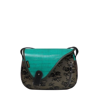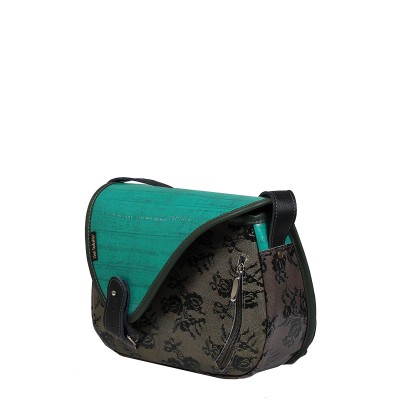 Listonoszka skórzana Mouse to średniej wielkości torebka handmade z popielatej skóry wzorzystej. Lakierowana zielona klapa i brązowy język z bolczykiem tworzą oryginalny design. Zamykana na suwak, z praktycznym wnętrzem – kieszeniami, smyczką i podszewką.