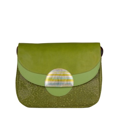 Unikalna Kolorystyka i Materiały – Front i boki torebki zostały wykonane z tłoczonego nubuku w subtelnym odcieniu jasnej zieleni, co nadaje jej świeżości i lekkości. Klapa torebki to połączenie dwóch odcieni skóry w zielonym kolorze, które pięknie kontrastują ze złotymi, żółtymi i niebieskimi akcentami dekoracyjnymi. Taki miks kolorów sprawia, że torebka staje się prawdziwym statement piece każdej stylizacji.