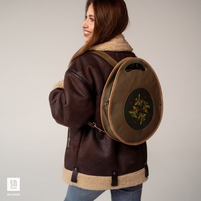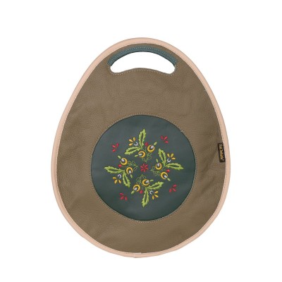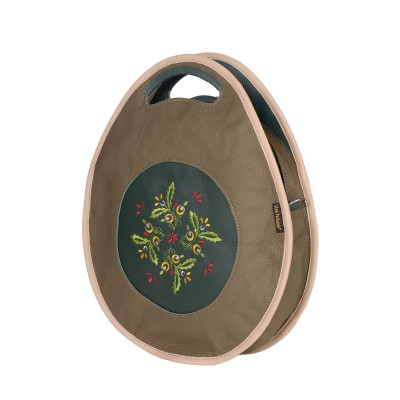 Główny kolor to zieleń oliwkowa, natomiast na froncie znajduje się okrągły detal w kolorze butelkowej zieleni, ozdobiony haftem w odcieniach zieleni, żółci i czerwieni. Brzegi torebki wykończono beżowym obszyciem, które podkreśla dbałość o detale.
