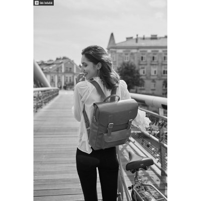 Wnętrze: kieszeń na laptopa, kieszeń na suwak, skórzana smycz na klucze, otwarta kieszeń, dwie kieszonki na długopisy, podszewka w odcieniach popielato-zielonych. Wymiary 35 × 31 × 8,5 cm. Solidny, funkcjonalny i kolorowy plecak skórzany na każdą okazję.